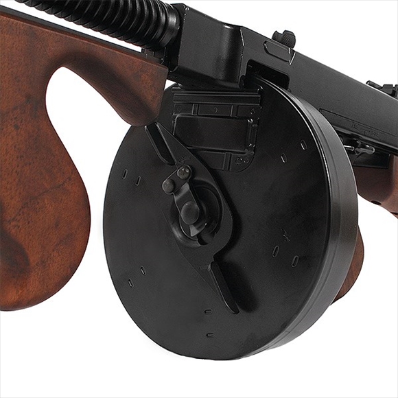 ギャング映画などでもよく目にするのが、ドラムマガジンと木製のフォアグリップが特徴的なこちらのシカゴタイプです。『アンタッチャブル』などにも登場しているので、トンプソンといえばこのシカゴタイプの印象が強いかもしれません。