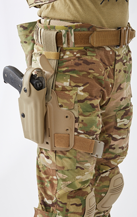 ▲サイ(レッグ)ホルスターは腰ではなく太ももに装着できるので、アーマーと相性がいい。ストラップによって太ももに密着させられるので、激しい動きをしても問題ない。強襲作戦が多いアサルターに使用者が多い
