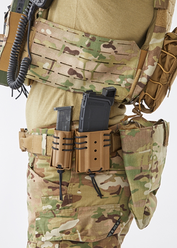 ▲一般的に、アサルターはライフルマグ1本とハンドガンマグ2本とをベルトキットに装着する。しかし、ハンドガンの使用頻度と軽量化を考慮して各マガジン1本を装着するスタイルも増えている。マグチェンジは、アーマーよりもまずベルトキットのポーチから行なう。そのため動きに干渉しないようにアーマーのサイドは極力空けておくことが望ましい