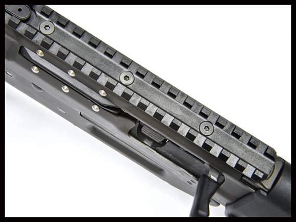アッパーレシーバーはSIG553特有の折りたたみ式ストックと20mmピカティニーレールが標準装備されており、スコープやドットサイトなどの光学照準器を搭載できます。