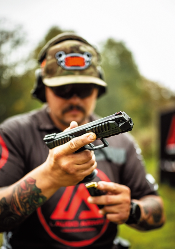 ヨーロッパで最も美しい都市プラハ。その近郊からエイリアンが生まれつつあります。速射性能を高めるため銃身を低く配置したピストルは、これまでにも数多く作られてきましたが、このエイリアンピストルは、それらとは次元が異なるレベルを実現しました。そのために、予想外のメカニズムを採用、また9mmピストルでありながら、銃身は固定で、そして前後のサイトも固定されているなど、独創性に満ちています。この銃は2019年の市販を目指して開発中で未完成ではありますが、もしかしたら最強のコンバットピストルになるかもしれません。