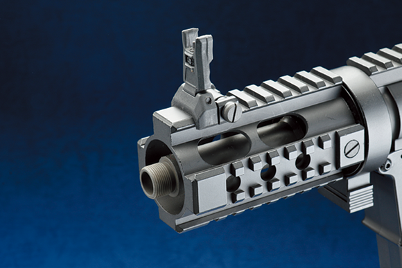 3.5インチのレールハンドガードを装備し、バレルには14mmの正ネジが切られ好みのマズルデバイスを選択できる