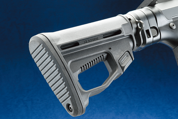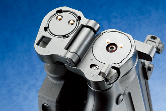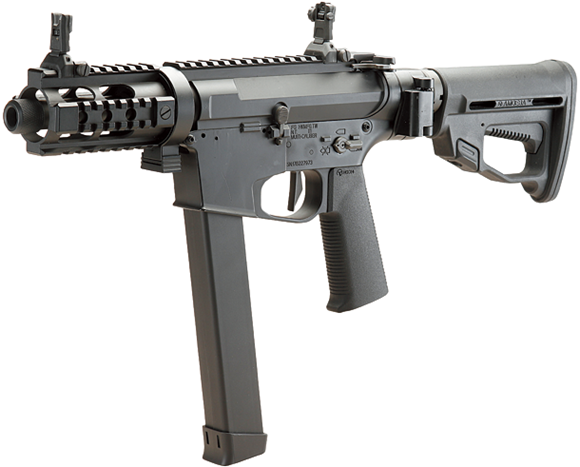 軽量でコンパクトなAMOEBA-PROストックがチョイスされており基部から折りたたむことができる。端子が接触することで通電するため、この状態では撃つことはできない