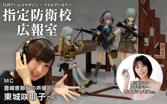 指定防衛校 広報室とは、メインパーソナリティに豊崎恵那役の声優:東城咲耶子さんとトミーテックの企画担当:最上さんを解説に迎え、リトルアーモリーの最新情報やココだけの話、様々な企画などにチャレンジする番組です。