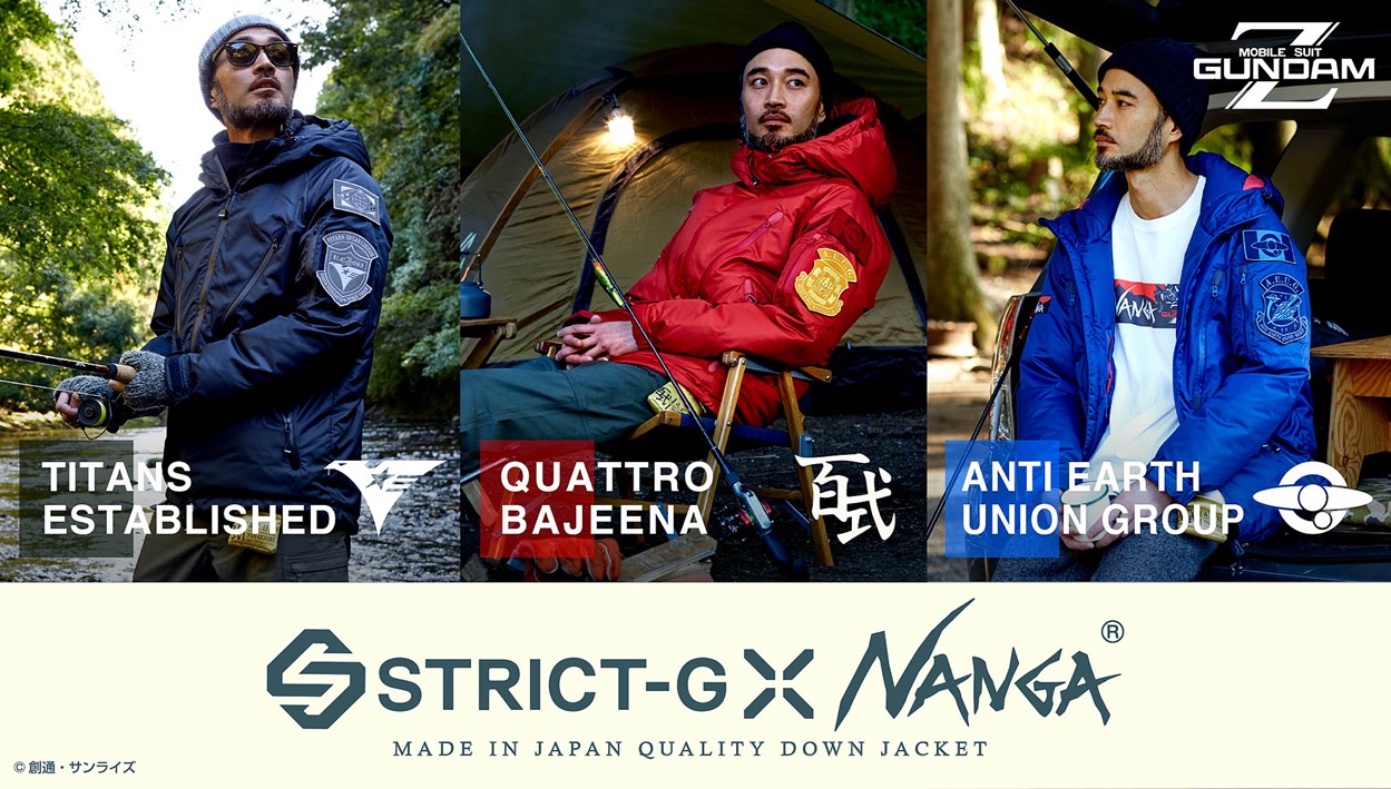 バンダイ公式ショッピングサイト「プレミアムバンダイ」( http://p-bandai.jp/?rt=pr )では、ガンダムの世界観を取り入れたアパレルショップ「STRICT-G(ストリクト ジー)」より、高品質なダウンを扱うダウンシュラフ・メーカー NANGA(ナンガ)と『機動戦士Zガンダム』とのコラボモデルダウンジャケット全3種『機動戦士Zガンダム』35周年記念 エゥーゴモデル/ティターンズモデル/クワトロ・バジーナモデル(各61,600円 税込/送料・手数料別途)、及びTシャツ1種(6,380円 税込/送料・手数料別途)、シュラフポーチ1種(3,850円 税込/送料・手数料別途)を発売。