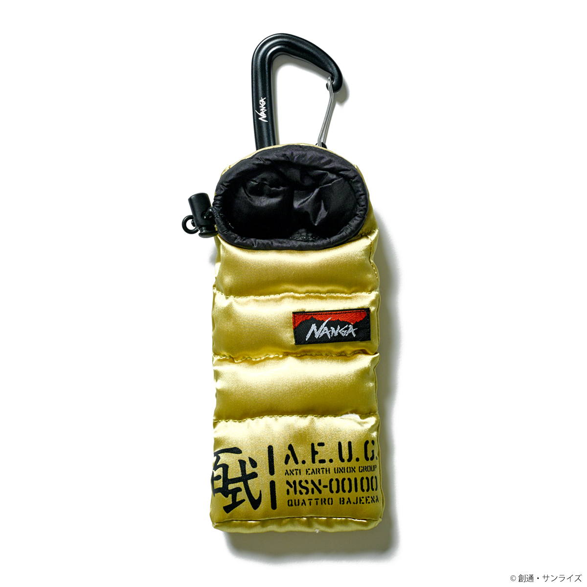 まるで本物の寝袋の様に羽毛も充填されている、遊び心満載のアイテム、シュラフ型ポーチ。ゴールドの本体カラーに、百式のロゴがデザインされています。