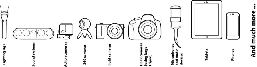 そして、ボディ内に収納可能なミニ三脚をはじめ各種アタッチメントも豊富で、様々なカメラやスマートフォンそして照明・音声・映像機器までひとつにまとめ片手におさめることができます。