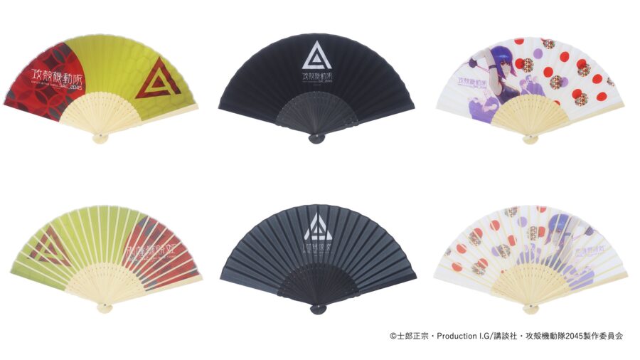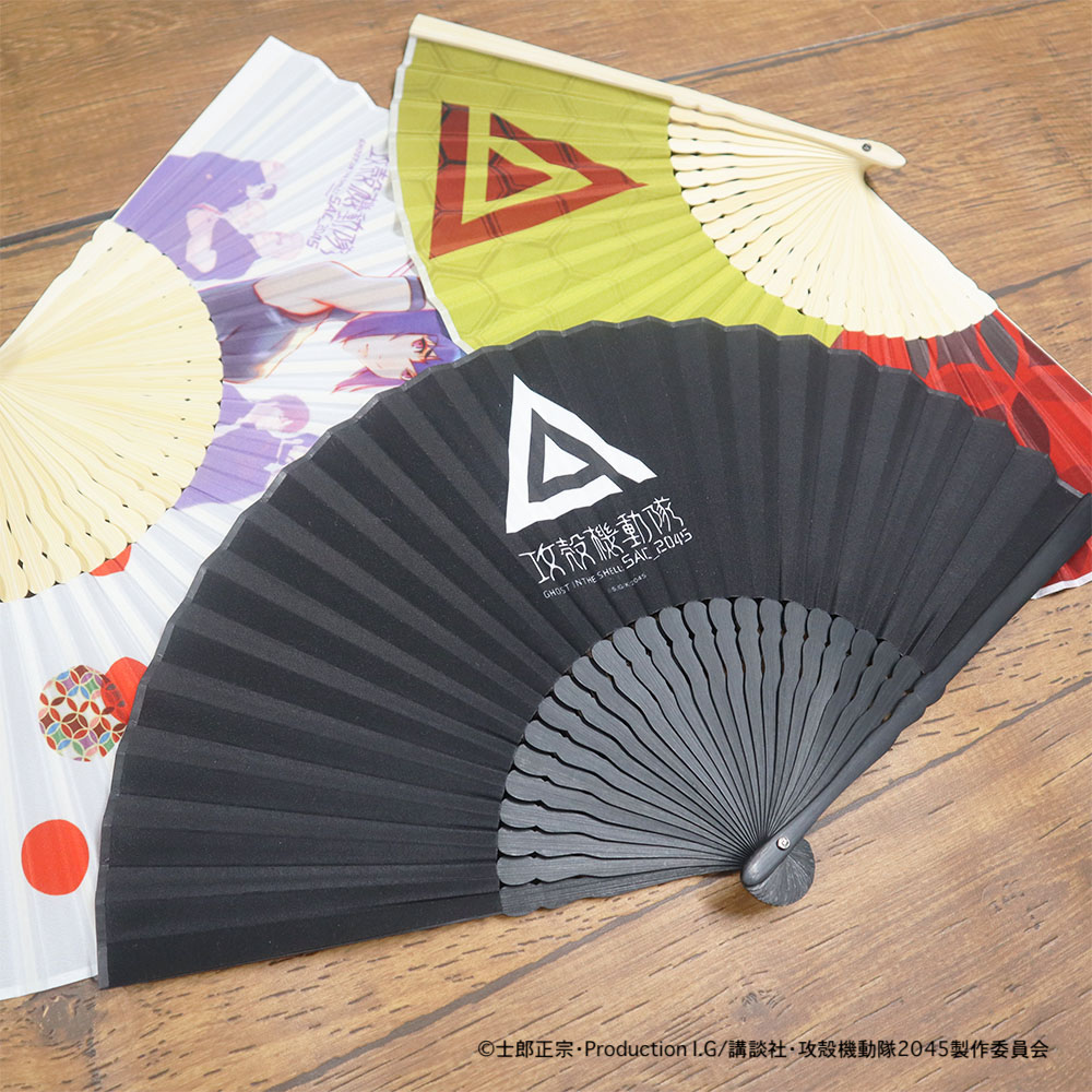 「攻殻機動隊 SAC_2045/扇子/」のバリエーションはゴールド、ブラック、ホワイトをベースに作品ロゴ、公安9課ロゴ、キャラクターを組み合わせた3種類の絵柄を用意。