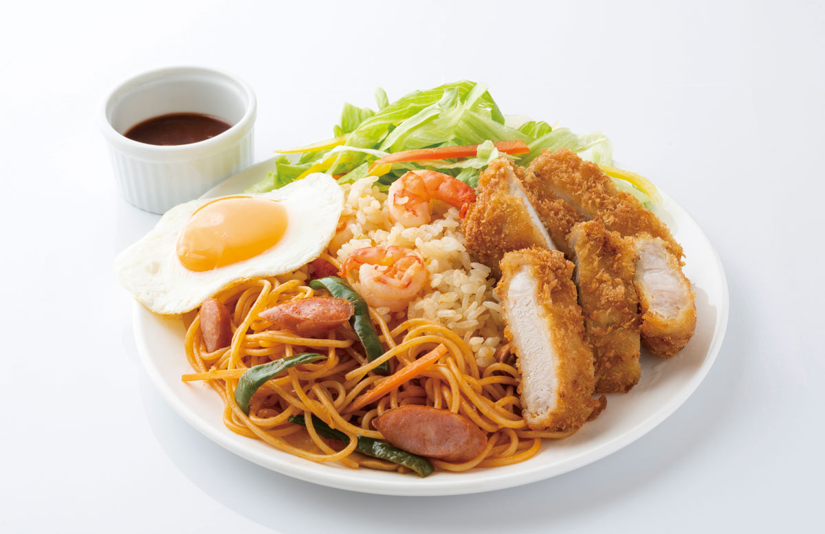 トンカツ、ピラフ、ナポリタンが1度に味わえる、なんともうれしいワンプレートメニューです。
