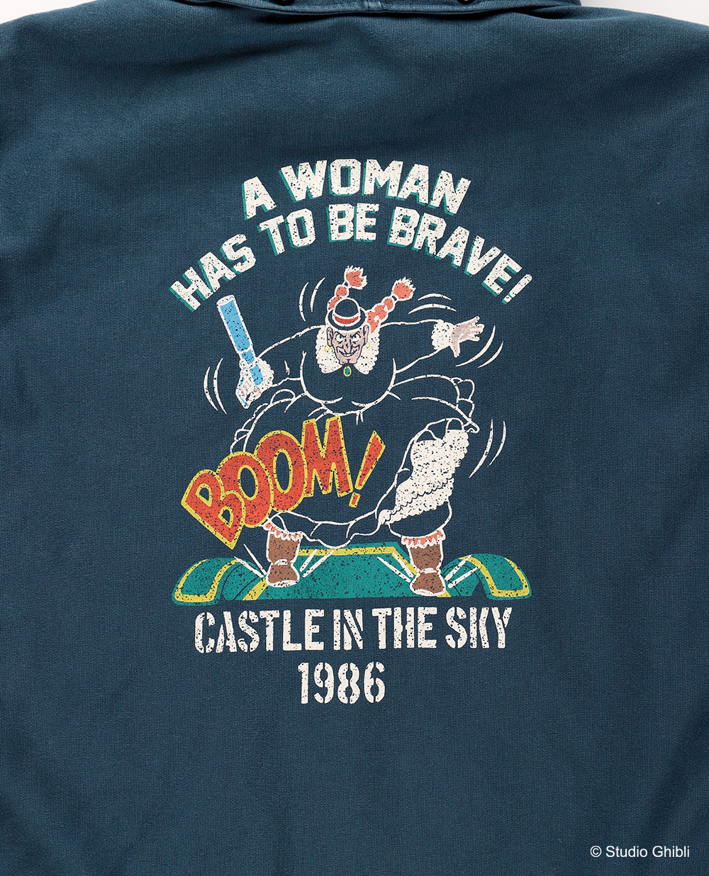 バックプリントにはドーラの名台詞「女は度胸だ!」という言葉が英語で入っており、「天空の城ラピュタ」ファンならぜひ手に取りたい逸品です。