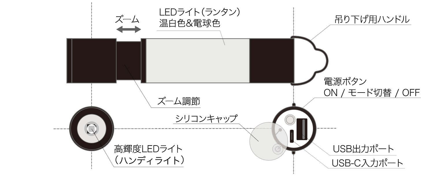 発行モード:ハンディライト Hi/Low(白色)、ランタン Hi/Low(温白色&電球色)