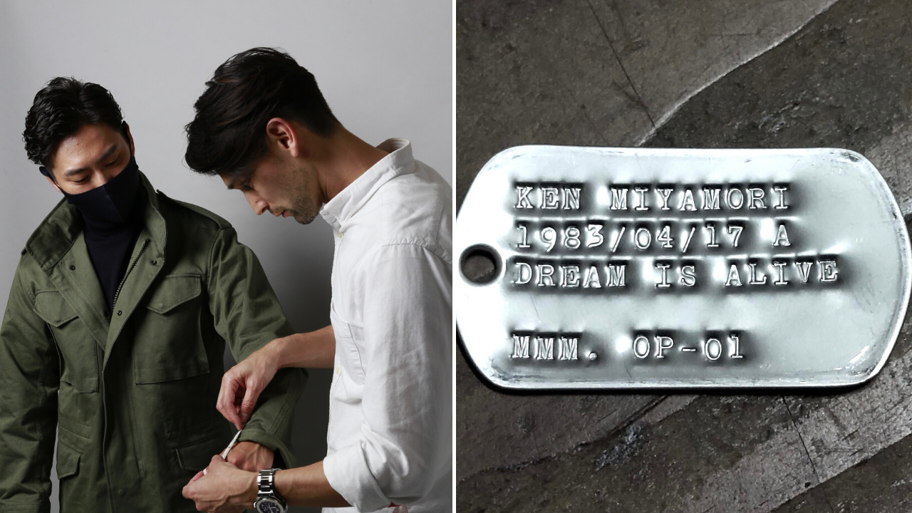 ①(左)総丈と袖丈をお客様のサイズに合わせセミオーダー ②(右)ドックタグには、アニキ(お客様)のお名前や格言などを打刻し、左の専用ポケットに納める
