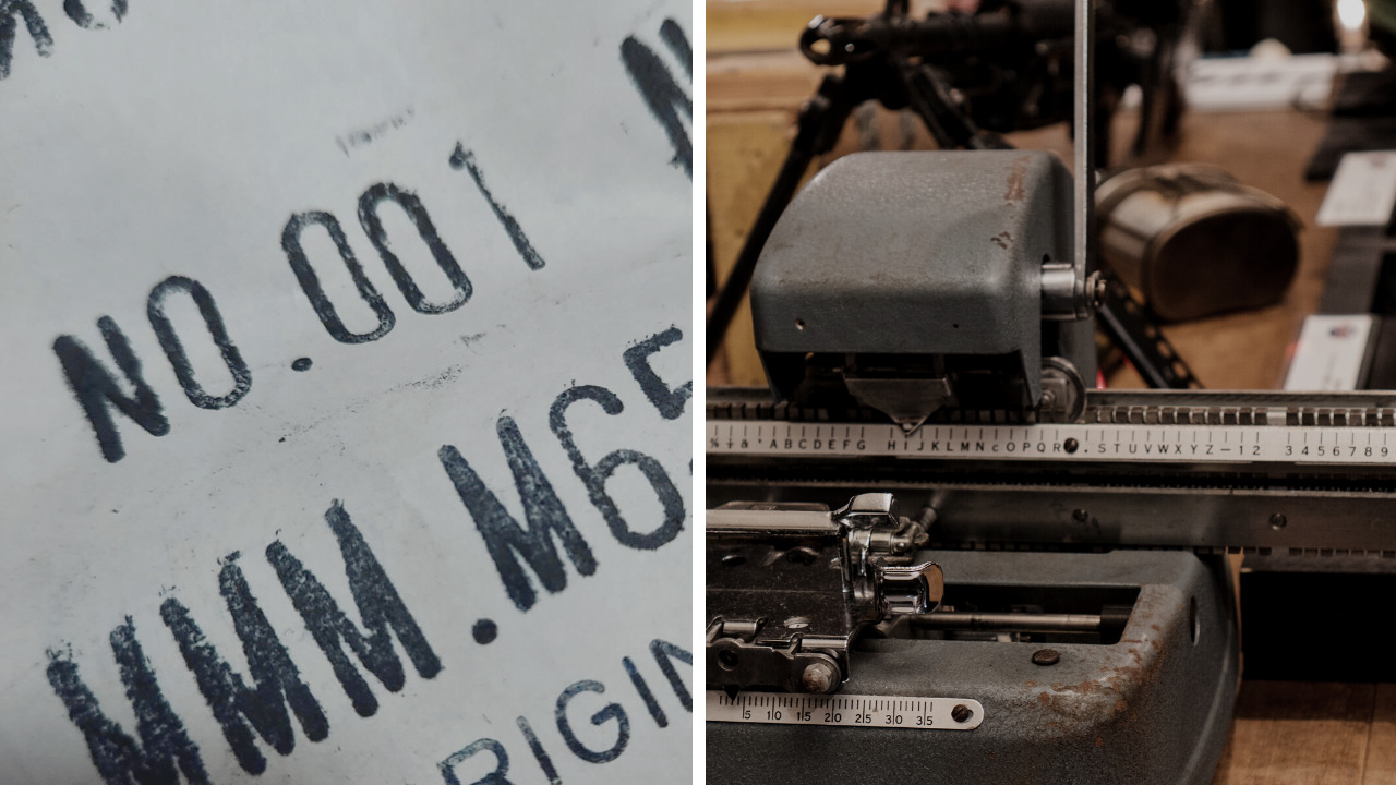 ⑤(左)インスペクションタグには一点一点シリアルナンバーを付与 ⑥(右)11月に開催したリアルミリタリー展。展示や参加型イベントでは、歴史あるものに触れたり、オーダー向け計測会などを実施