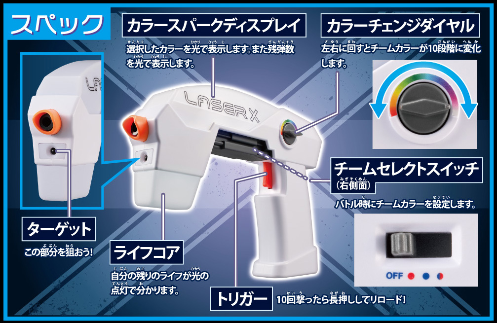 「赤外線で安全」、「何名でも遊べる」、「室内&屋外で可能」、「飛距離が長い」点が人気のシューティングゲームシリーズです。