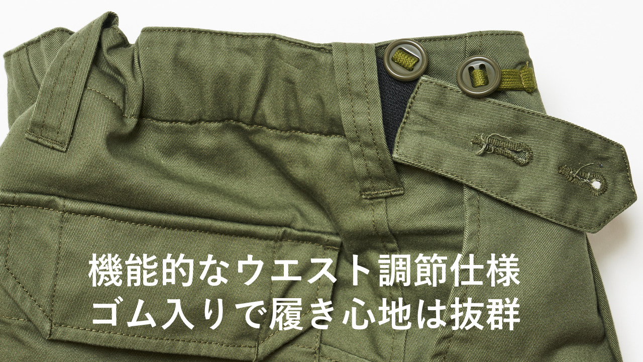 パンツのサイズで一番難しいウエストは2段階調整が可能となり、幅広いウエスト寸に対応しているため、キャンプ施設などの貸出し用としても最適な商品となります。