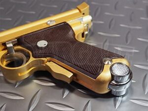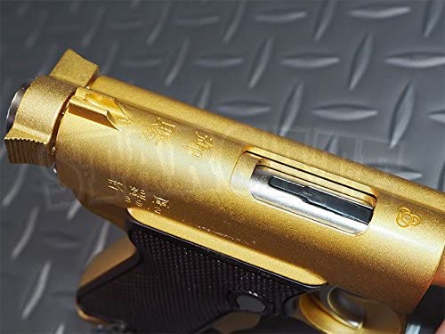 金属製のモデルガンを作るのに際して、実銃のカラーは使えないので、ゴールドメッキになったのだと推測することができる。