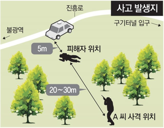 タクシー運転手は北漢山の生態公園から、舊基トンネル側の方向に向かって立ち小便をしている途中、右側約20~30m離れた場所からのA容疑者の銃撃を受けた。一度に発射された弾丸は2発で、それぞれ右手首と腹部を貫通してその場に倒れた。A容疑者の申告を受けて出動した救急隊がタクシー運転手を近くの病院に搬送したが、約5時間後の先月30日午前0時52分頃に死亡した。