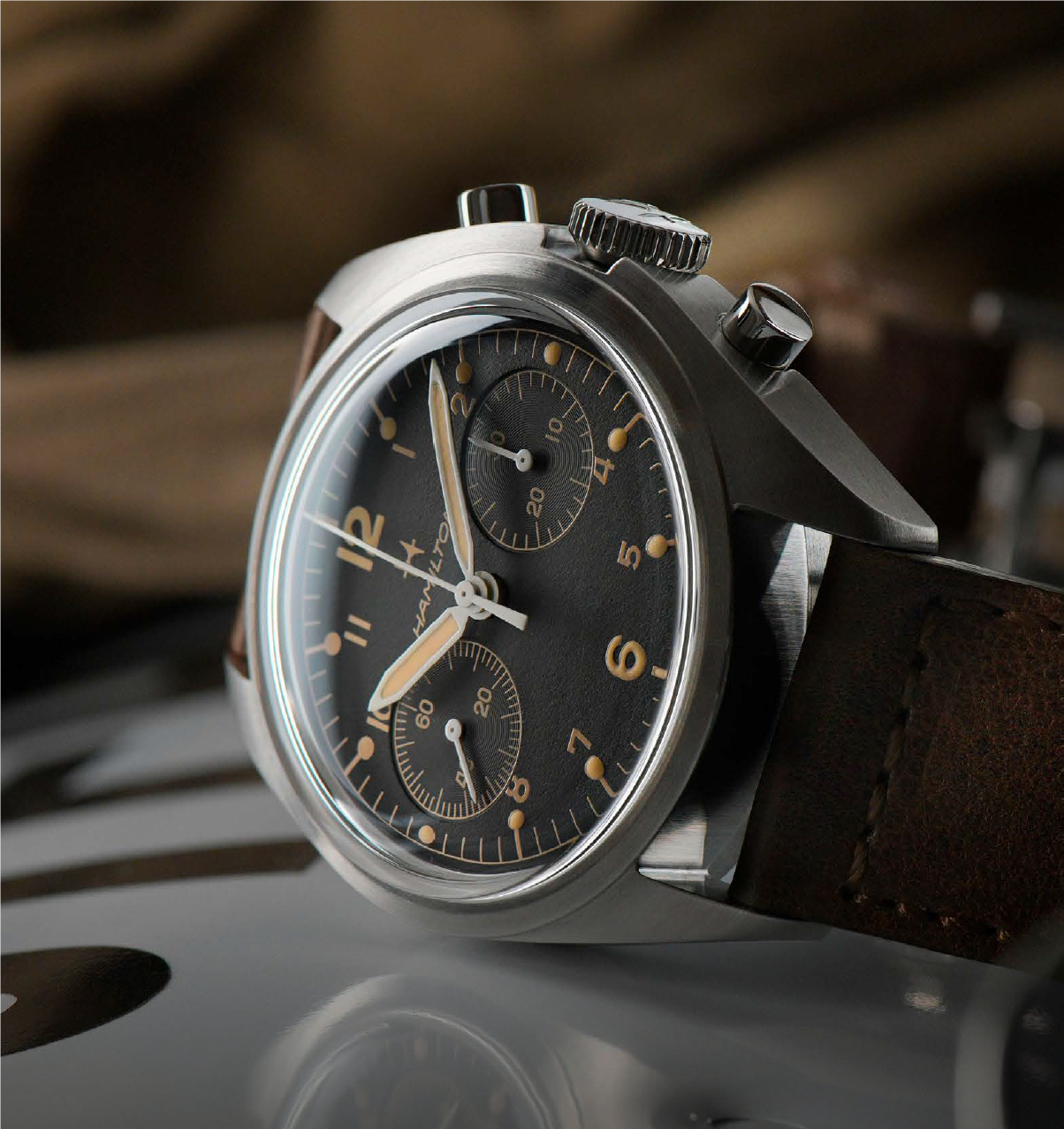 歴史的ルーツに忠実なこのモデルは、1970年代にハミルトンが英国空軍(RAF)のパイロットのために製造したクロノグラフの特徴的なディテールを想わせるデザイン。
