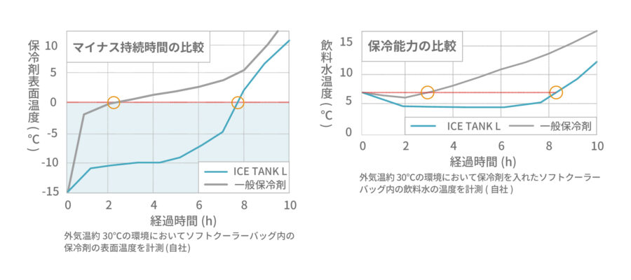 気温30℃下のクーラーバッグに入れても、保冷剤の表面温度は7時間以上氷点下をキープする保冷効果があります。