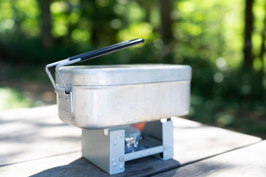 1.洗った米2合と水350mlをメスティンに入れ、30分放置する。(浸水時間)