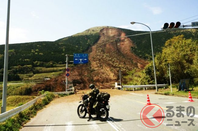 災害派遣でも先行偵察する。平成28年4月の熊本地震で阿蘇大橋に進出した偵察オートバイ。(画像:陸上自衛隊)