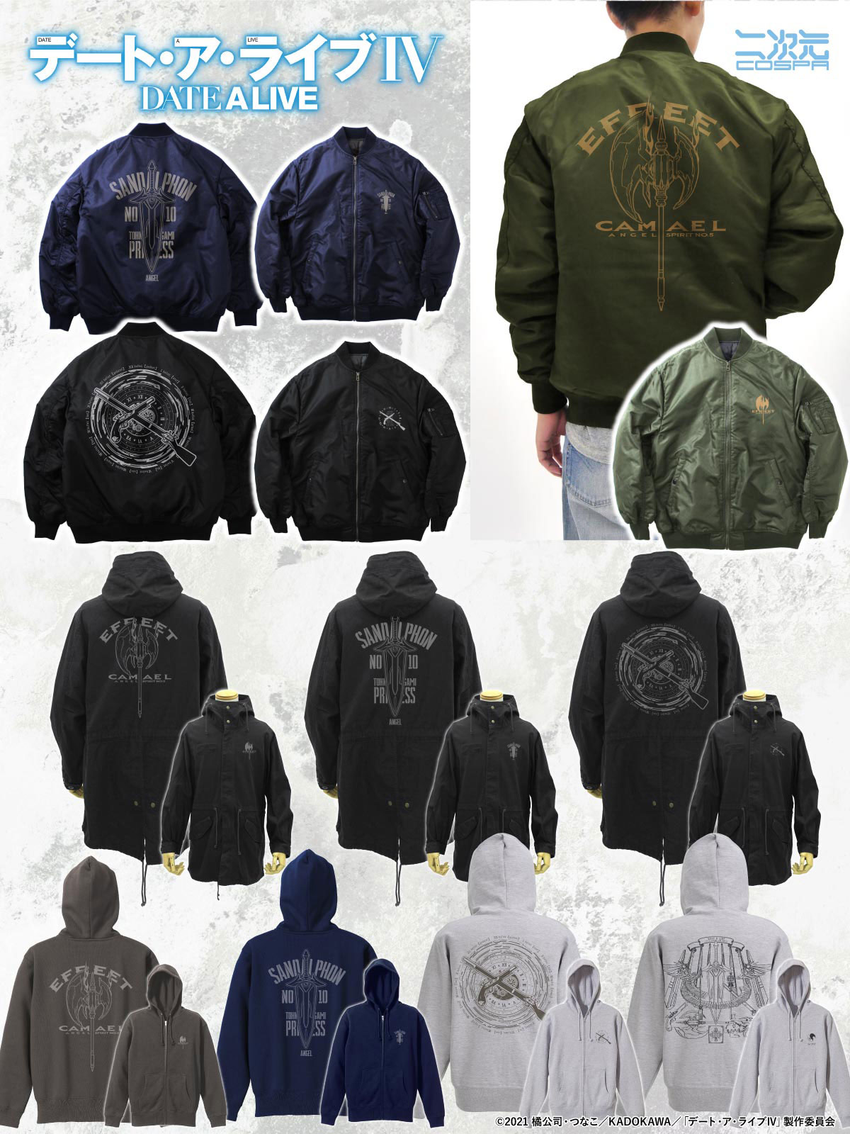 『デート・ア・ライブIV』より、夜刀神十香「鏖殺公<サンダルフォン>」、五河琴里「灼爛殲鬼<カマエル>」、時崎狂三「刻々帝<ザフキエル>」それぞれの天使をモチーフにした「MA-1ジャケット」をはじめこの冬活躍するアウターなど新グッズが登場です。