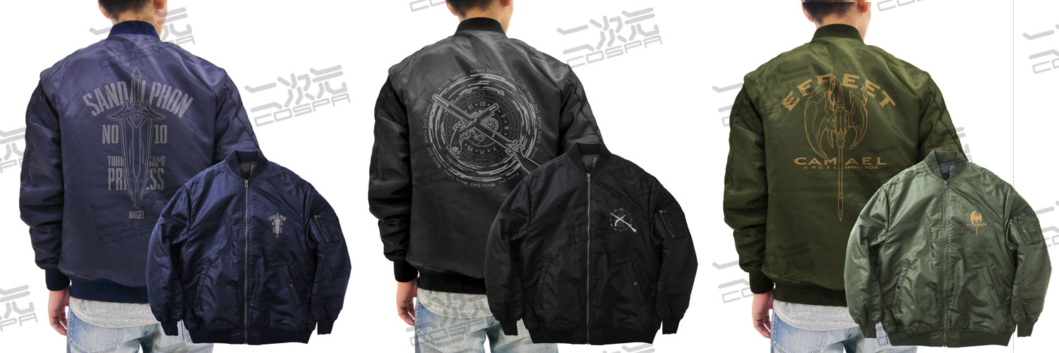 ・フライトジャケットの定番でもあるMA-1に『鏖殺公<サンダルフォン>』『刻々帝<ザフキエル>』 『灼爛殲鬼<カマエル>』をプリント。
