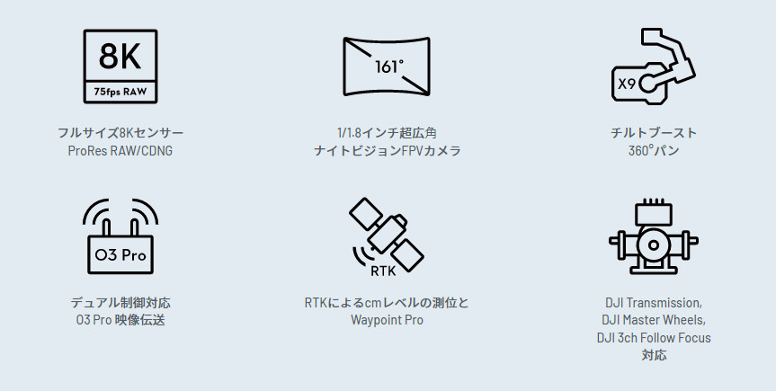 ドローンを使った映像制作を未知なる世界に引き上げるために進化した Inspire 3 は、専用設計の8K対応フルサイズセンサーカメラを搭載し、思い通りの撮影を実現する飛行性能や、作り込みと効率化を両立するための高精度なリピート自動撮影、3軸ジンバル、可動式ランディングギアなど、オンリーワンの機能を満載しています。