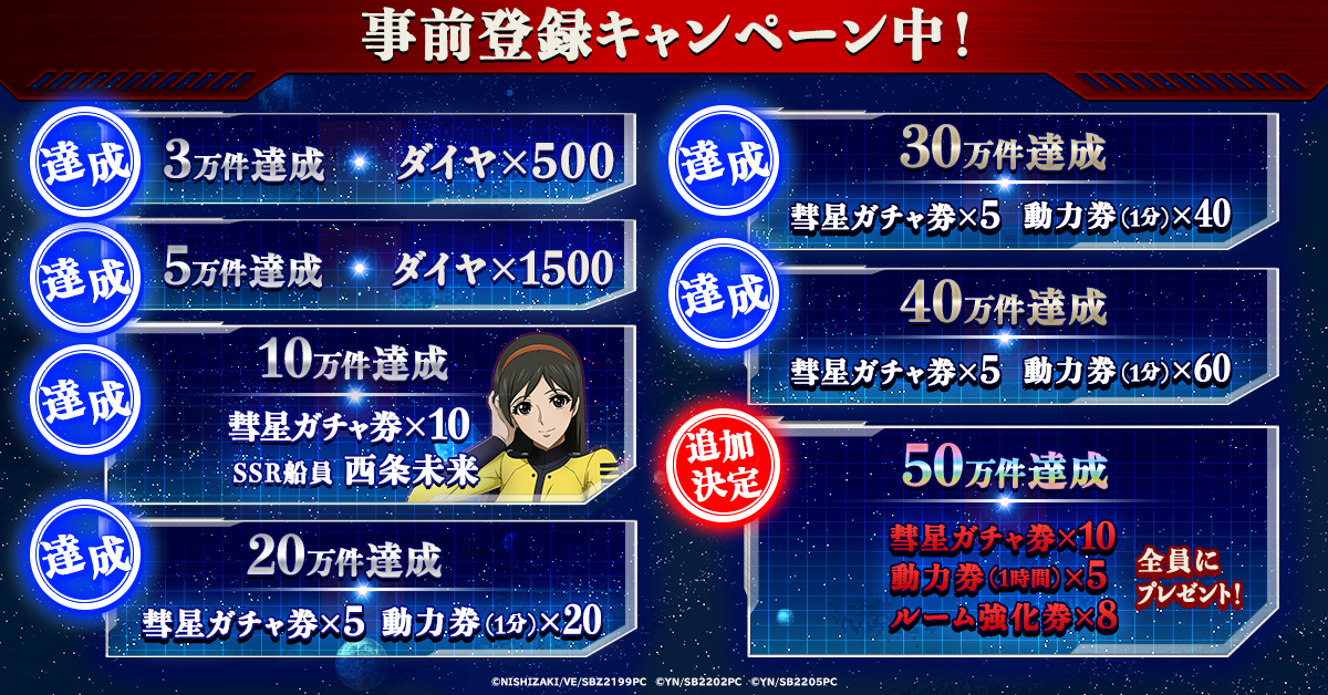 事前登録数の合計が40万件を達成したため、25連分のガチャアイテムと、SSR船員「西条未来」を、サービス開始時に全員にプレゼントすることが決定。