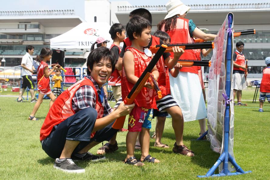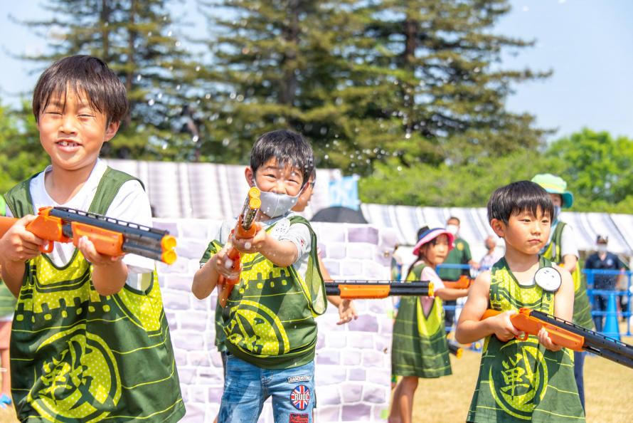 本イベントは2軍に分かれて、火縄銃型の水鉄砲で撃ち合うびしょ濡れ必至のウォーターバトル。