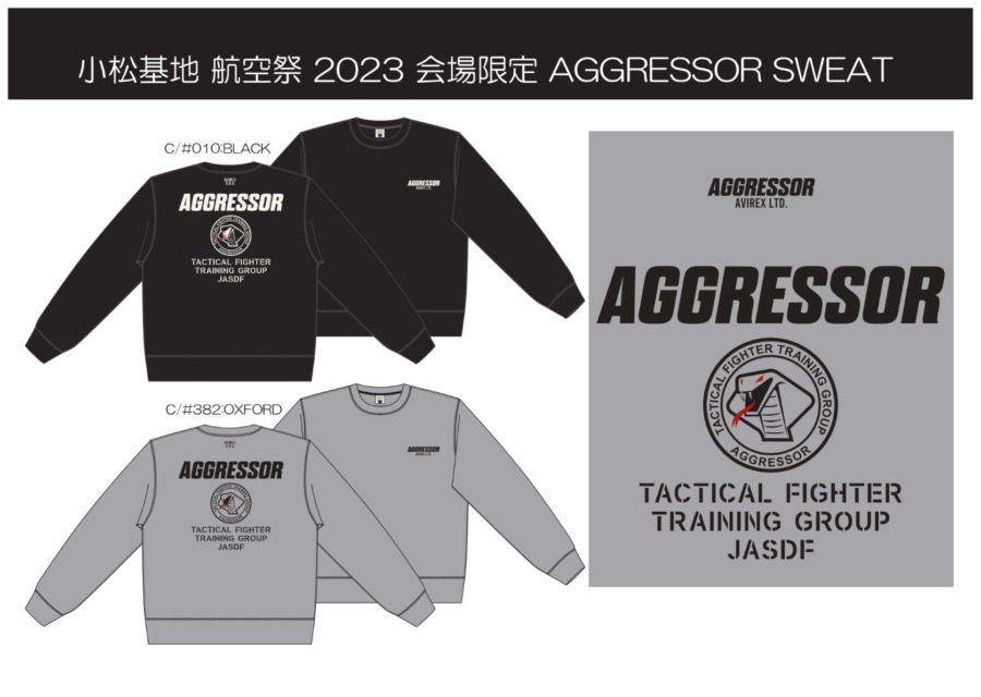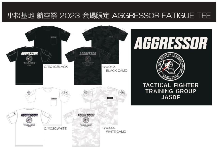 特に今年は「小松基地航空祭2023」のために航空祭限定販売のアグレッサーTシャツやスウェットもご用意しています。