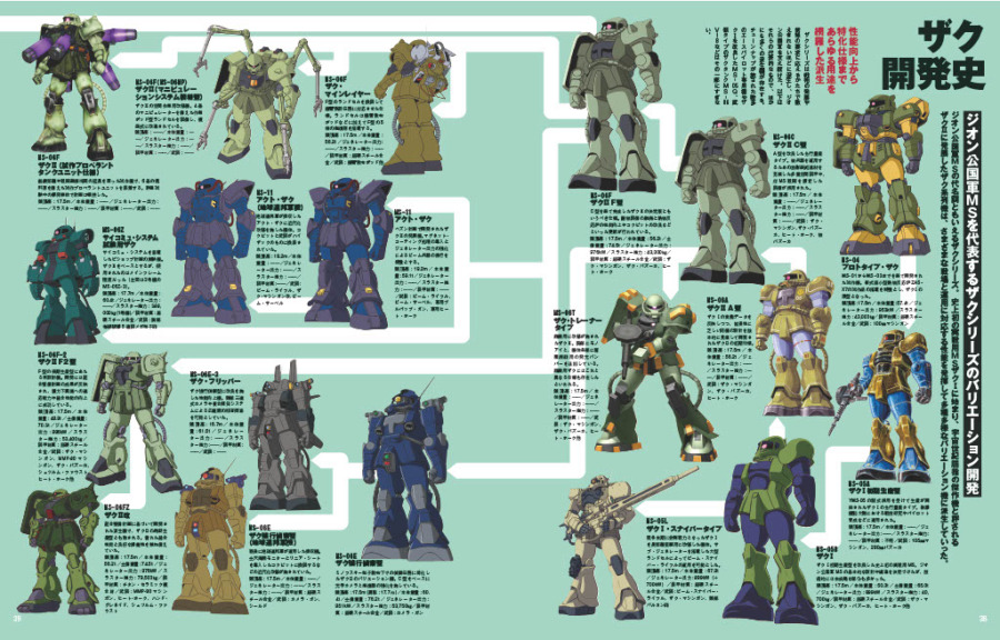 ジオン公国パートではジオン公国軍のMS開発から始まりザク・グフ・ドムの開発や水陸両用MS開発・ゲルググ・ニュータイプ専用機動兵器の開発などを紹介。