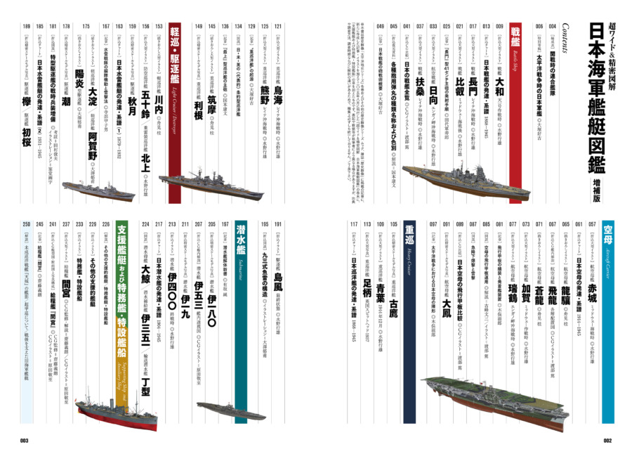 本書は2015年に刊行したロングセラー『超ワイド&精密図解 日本海軍艦艇図鑑』に、新たに「支援艦艇および特務艦・特設艦船」の章(24ページ)を加えた増補版となっています。