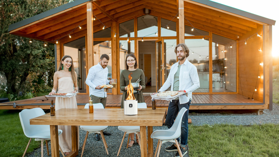 パチパチと音を立てる炎は、心温まる会話と充実した時間の背景となります。