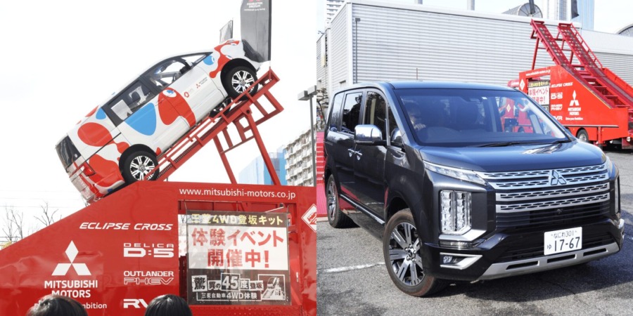 デリカD:5で最大傾斜45度の急坂登坂走行を始め、過酷な路面状況をイメージした走行キットで、三菱車の力強さ&4WD性能を体験しよう。