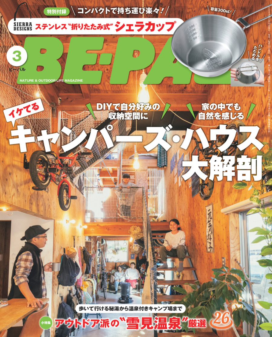 2月8日発売、BE-PAL3月号の特別付録は、キャンプはもちろんオフィスでも活躍する SIERRA DESIGNS× BE-PAL『ステンレス"折りたたみ式"シェラカップ』。