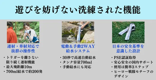 このウォーターガンは、見た目がヒーロー戦隊の武器に似ているだけでなく、機能面でも子どもたちが想像力を最大限に発揮できるよう設計されています。
