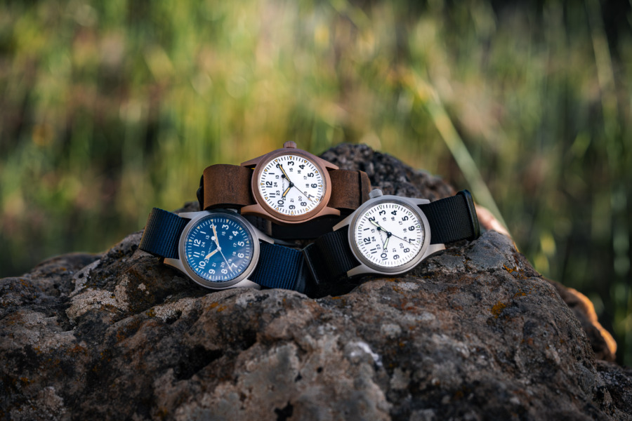 単色の組み合わせが、フィールドウォッチの伝統的なアースカラーに新次元の色彩をもたらしています。