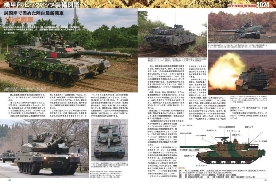 戦車や装甲車、りゅう弾砲などの主な装備を統一スケールのイラストとともに収録し、陸上自衛隊の戦力を多角的に理解できる内容となっています。