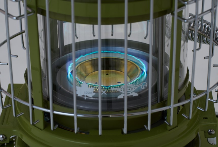 また、コラボ限定デザインの自然なグリーンの色合いとロゴマークが特徴的で、LOGOSのパノラマガラス構造により、360°全方向から炎を楽しむことができます。