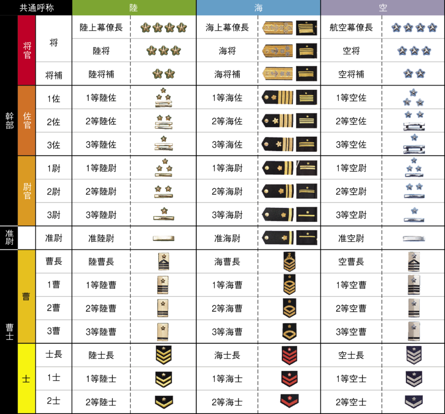 陸上・海上・航空各自衛隊の階級と階級章