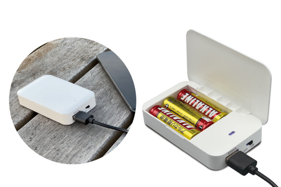 電池式なのでコンセントやソーラーパネルがない場所でも、スマートフォンや小型デバイスを手軽に充電可能。