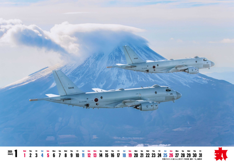 富士山をバックに飛ぶ哨戒機や最新型の護衛艦・潜水艦など迫力あるカットが満載です。
