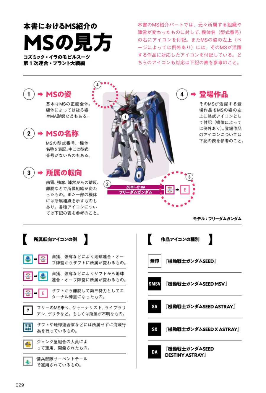また、SEEDシリーズのモビルスーツをより深く理解するため、「年表で振り返る コズミック・イラの世界」「ザ・MSパイロットファイル」「モビルスーツ関連用語集」も掲載しています。
