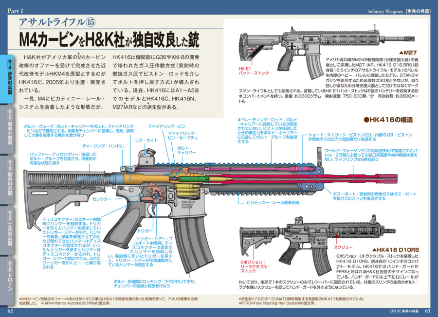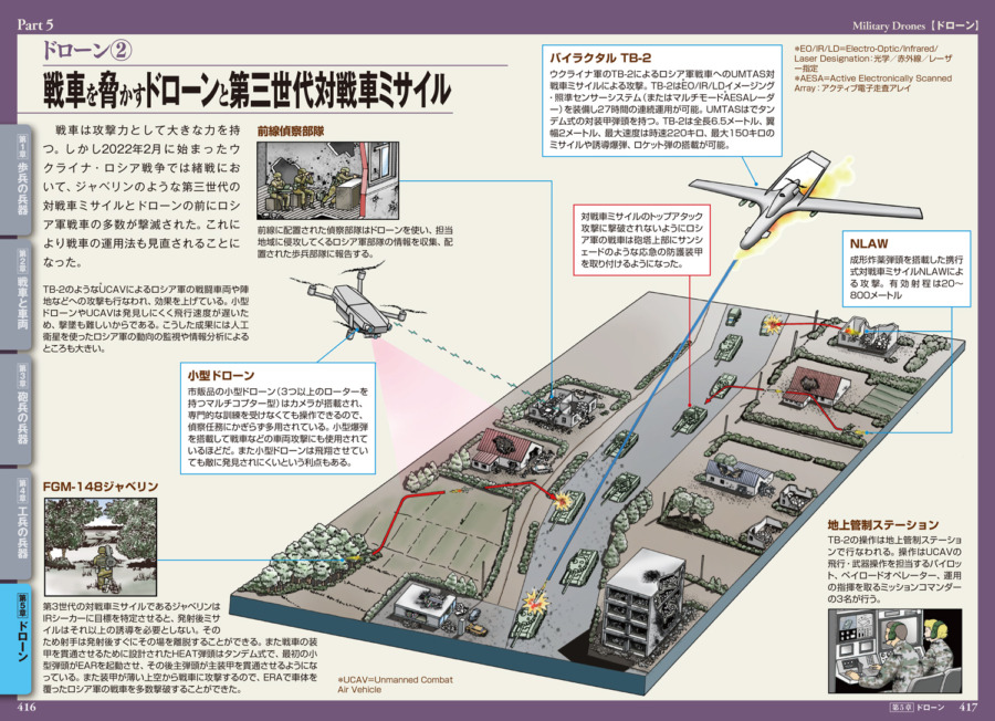 以上の章立ての中で、アサルトライフル、機関銃、戦車、歩兵戦闘車から各種火砲、工兵車両、各種ドローンまで、さまざまな兵器のメカニズムと運用法、使い方、戦い方を徹底的に図解します。