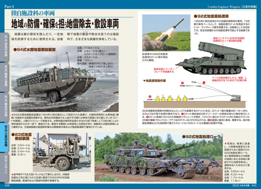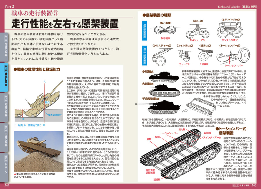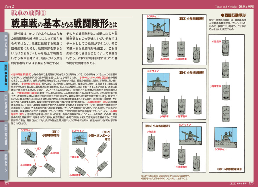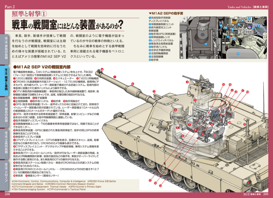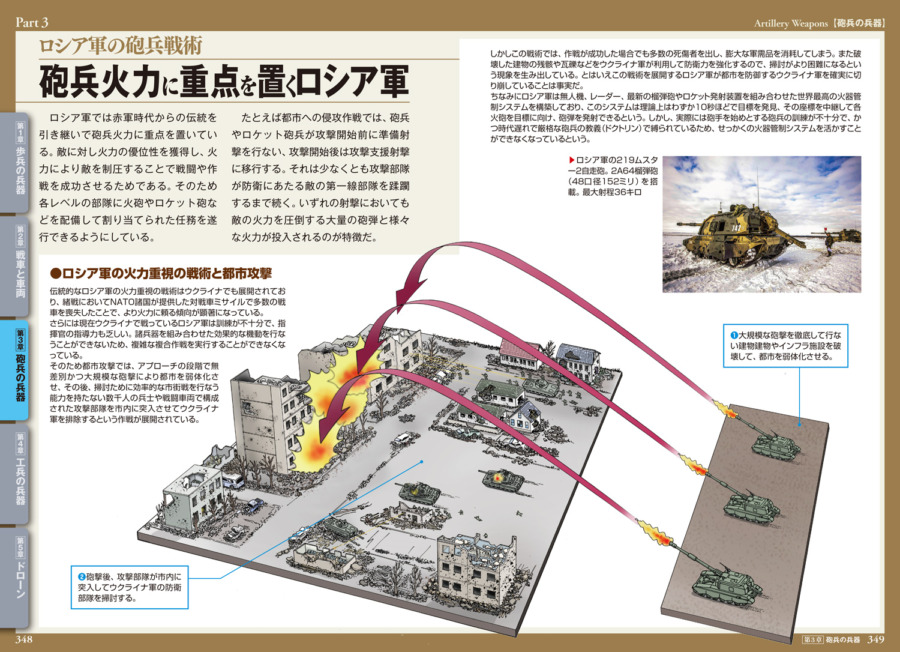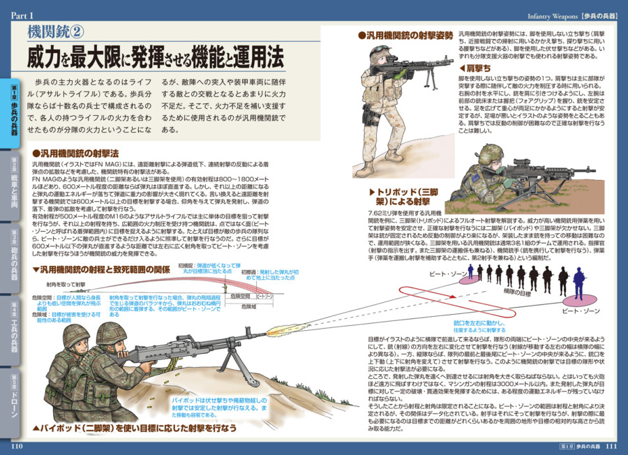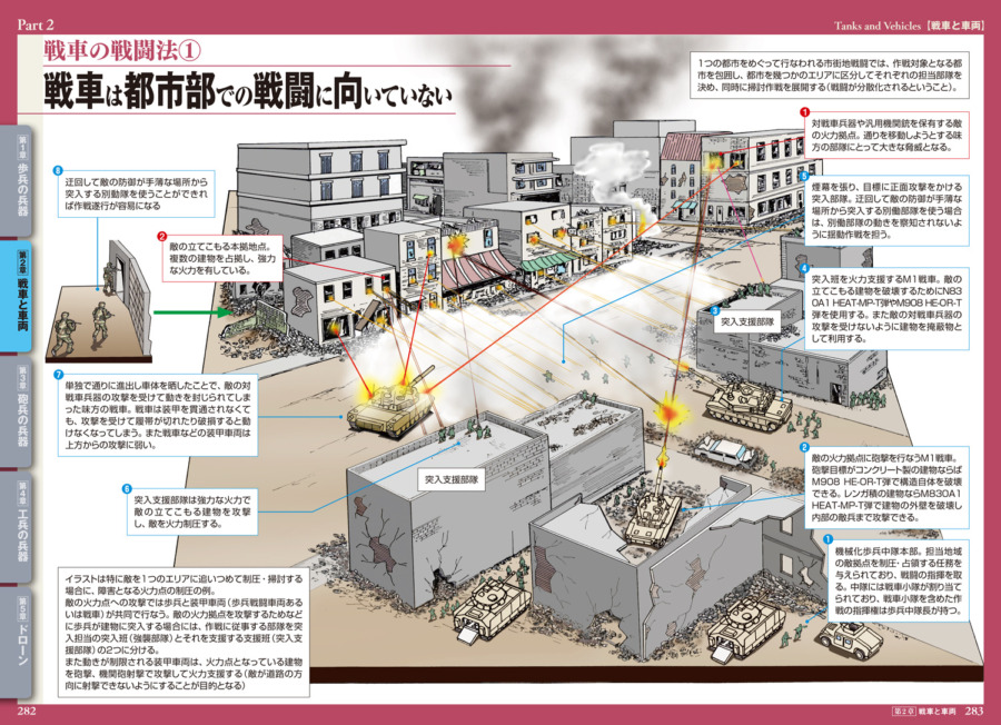 以上の章立ての中で、アサルトライフル、機関銃、戦車、歩兵戦闘車から各種火砲、工兵車両、各種ドローンまで、さまざまな兵器のメカニズムと運用法、使い方、戦い方を徹底的に図解します。