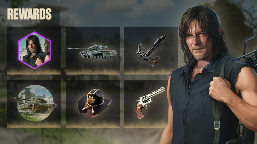 報酬には、黙示録的な世界観に合わせて設計された特別な戦車 Herdbreaker、T32用のレジェンダリー迷彩 Georgia Tracker、ダリルのクロスボウやバイクなどのコレクションが含まれ、荒廃したウォーキング・デッドの世界をイメージした多数のアイテムが登場します。