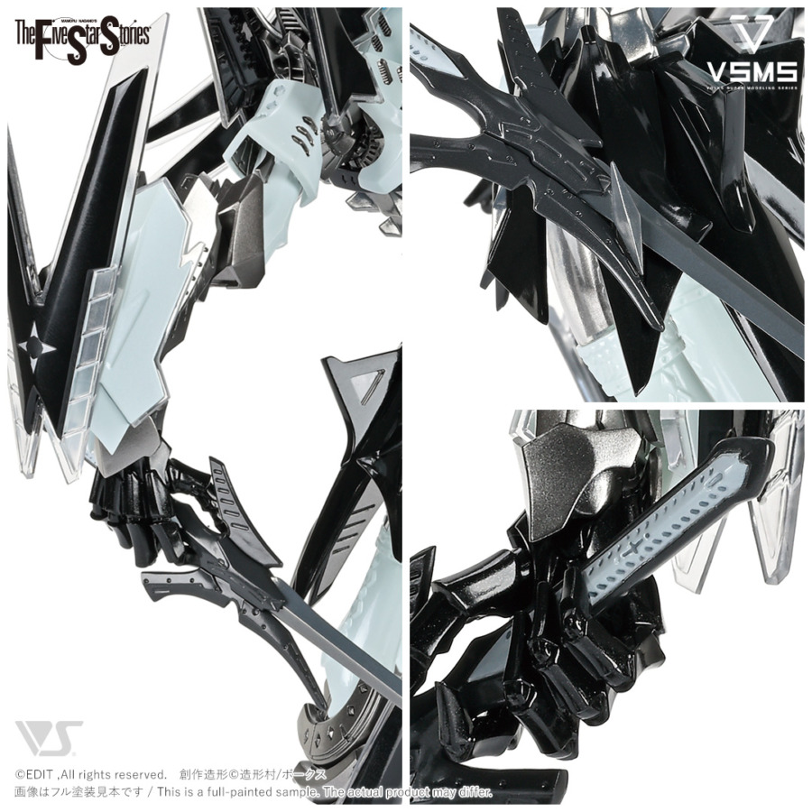 VSMSの可動については、原作者・永野護が提示した全く新しい「ツインスイング」機構を、従来の金型の制約に囚われた設計思想では到底なしえない、想像をはるかに超えるシンプルかつ斬新なパーツ構成で徹底再現。