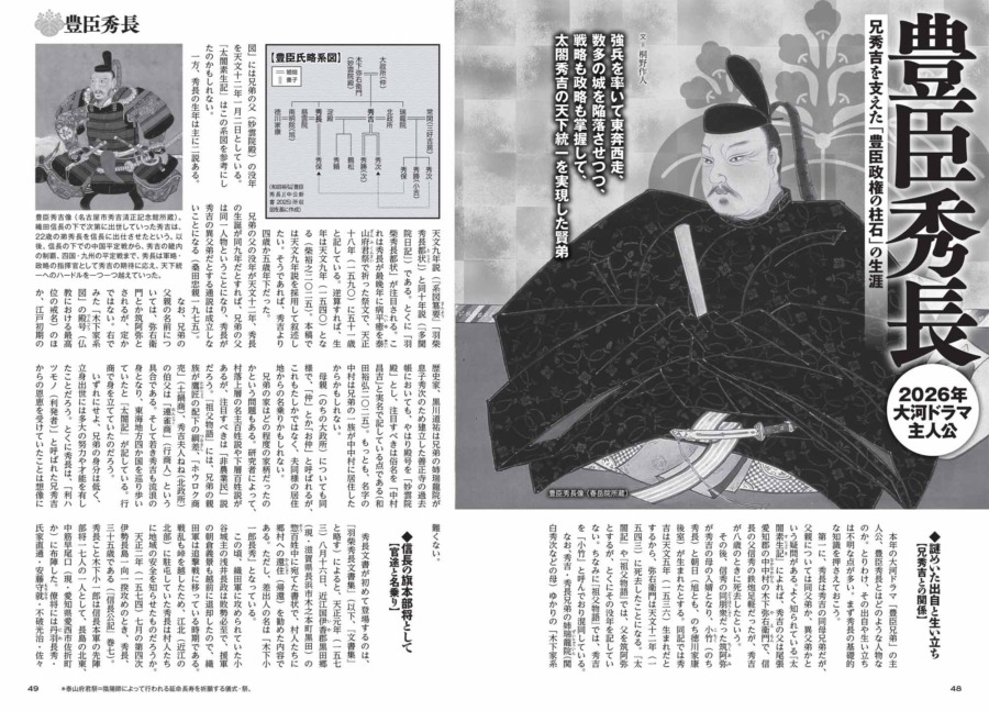 第二特集は、本年の大河ドラマ「豊臣兄弟」の主人公で、仲野太賀さんが演じる豊臣秀長の生涯と素顔に迫る人物伝です。