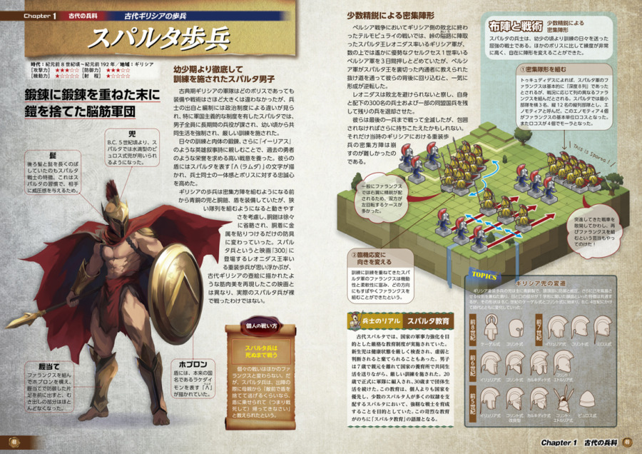 シュメールの戦士からナポレオン時代の軍に至るまで、各時代・各地域に存在した特徴的な兵科を取り上げ、装備や武器、防具の変化、部隊編成、そして戦術の進化を、豊富な図版とともに紹介しています。